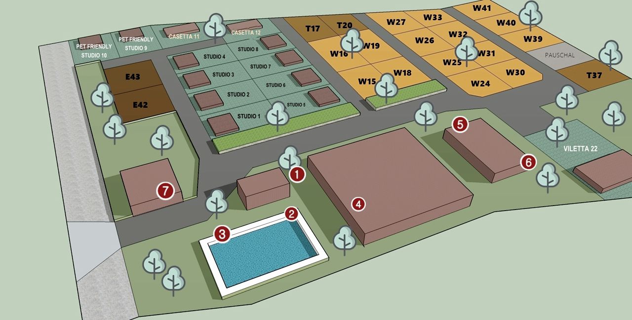 T PIAZZOLE – piazzole destinate a tende e mini camper (es. Bus VW). Inaccessibili a camper e roulotte di grandi dimensioni.